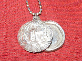 I made a locket this weekend and learned several new techniques. The locket was made in two pieces with the front of the piece stamped with a face. I dried the piece on Rizzo's, the cat's, ping pong ball to get the curved look for the front piece. The hardest part of this piece was making the little pieces to hang the piece from. I tried and tried to get these looking right. When I took the piece home, I silver blacked it to get it an old look and add depth to the piece. You can't really tell in this picture because of the flash on my camera. I also added a mirror,that Colleen gave me (thanks, Colleen) to the inside of the piece. It turned out great and I love how the front piece is open for interpretation. I'm wearing it today and when people see it they all have their own idea of what it is supposed to be. Sun goddess, mother nature, Anne Klein lion, you name it!